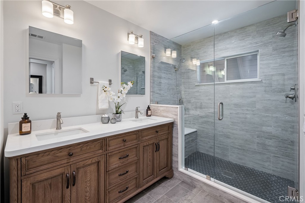 The upstairs level has been thoughtfully remodeled to enhance functionality. A luxurious primary suite, complete with walk-in closet, and bathroom featuring a glass enclosed two-person shower, provides a restorative space. The upstairs also hosts two additional bedrooms, generous amounts of built-in storage, a hall bath, and a conveniently placed upstairs laundry room. A bonus office space, combined with current high speed internet and fiber available at the street, provide an easy set-up to work remotely. A whole-house water filtration system, solar panels, and Tesla PowerWall batteries ensure efficiency and comfort year-round.